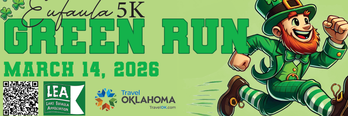 The Lake Eufaula Association is hosting the 5th Annual Eufaula Green Run 5k on March 14th with a start time of 9AM. The event will start and finish at Eufaula Cove Pavilion on Lakeshore Drive and will be run on a USATF Certified 5k Course along the shore of Lake Eufaula.