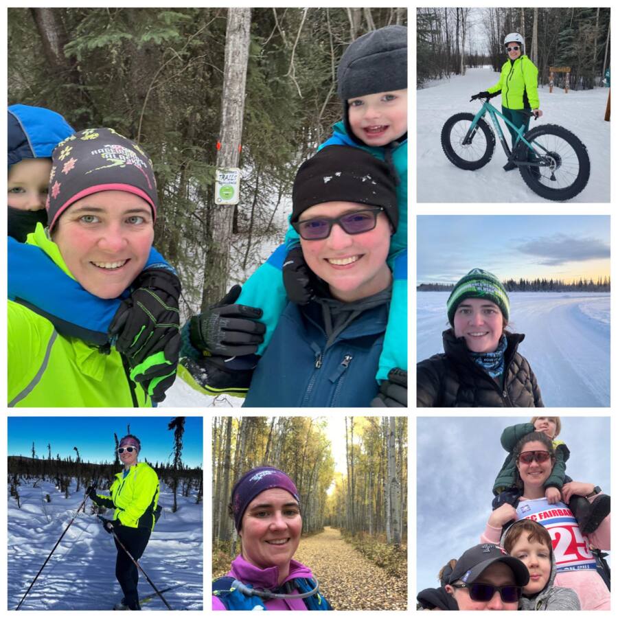 Hi, my name is Suzanne. I live in the Fairbanks area with my wife and our two boys. I am excited to be an ambassador for the Trifecta again this year. I use the challenges as motivation to stay active during the school year so I can have fun participating in The Arctic Triathlon Series during the Fairbanks summers. When I moved to Alaska I was given the advice “get outside” as a way of surviving the winters. This outlook has helped me transition from surviving to thriving and I look forward to the chance to get outside for a little bit each day. In the past I’ve packed a kid in a backpack or pulled them in my chariot but now they are getting older 3 & 5.5 and my new challenge has been learning patience to go at their slower paces and creativity to keep them entertained while we run, walk, and skip down the trails. I am working to introduce them to skiing and ice skating. I am also finding enjoyment with indoor workouts of zwifting on my bike, running on my treadmill, and new this year dabbling with yoga and other stretching videos with my kids following along beside (and sometimes on top of) me. I am grateful for my chances to sneak in a solo workout or a walk and talk with my adult friends.