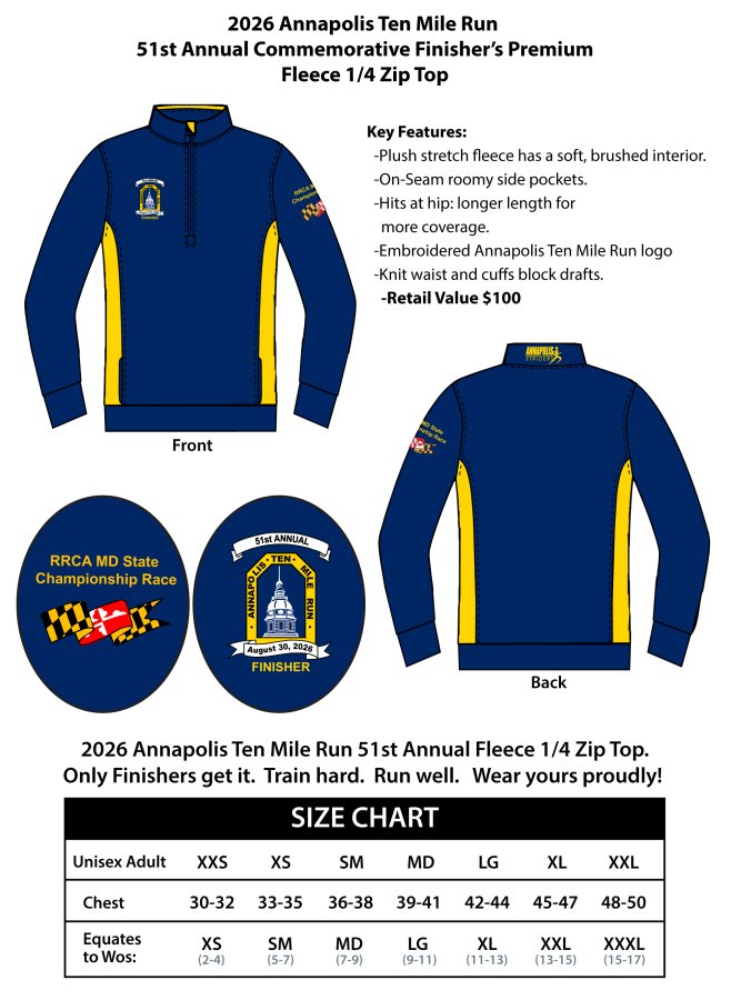 The 2026 Finisher's Premium is a custom Heavyweight Cotton Fleece 1/4 Zip! Full design and size details are below. You must complete the race to receive the finisher's premium; they will not be distributed at the expo.