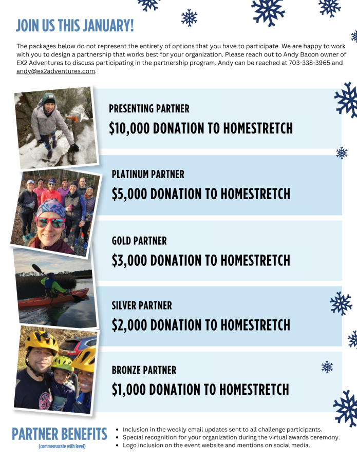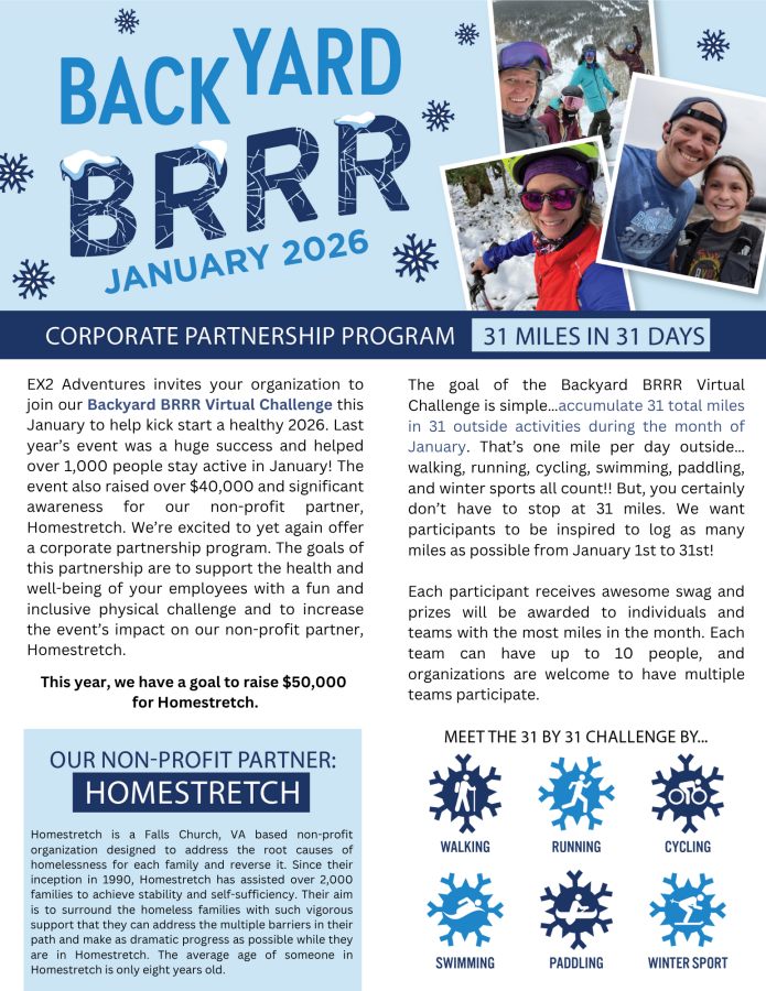 EX2 Adventures invites your organization to join our Backyard BRRR Virtual Challenge this January to help kick start a healthy 2026. Last year’s event was a huge success and helped over 1,000 people stay active in January! The event also raised over $40,000 and significant awareness for our non-profit partner, Homestretch.