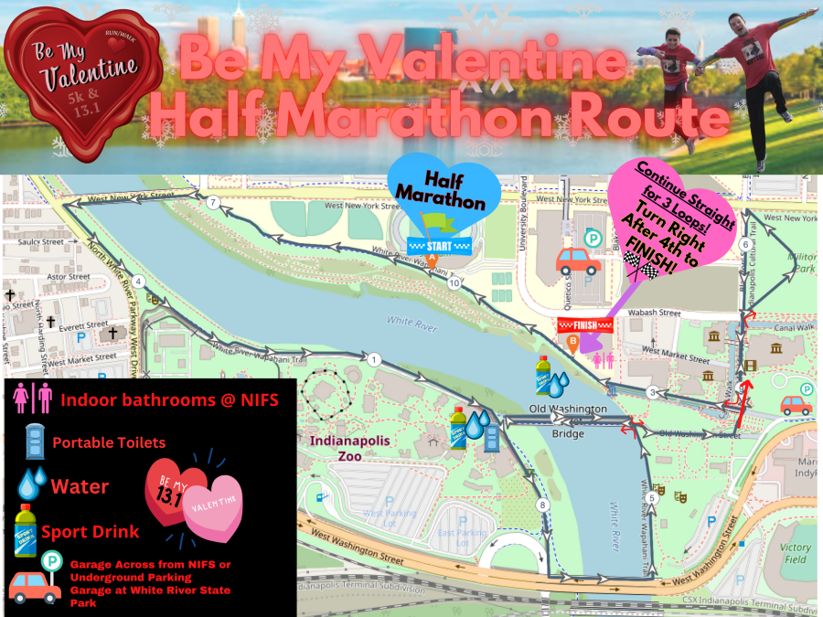 Half Marathon will Start about 200ft from the Finish Line (NIFS) and will continue straight for 3 more Loops and Turn RIGHT to finish after the 4th loop around White River State Park - Fast, Flat Beautiful Course!