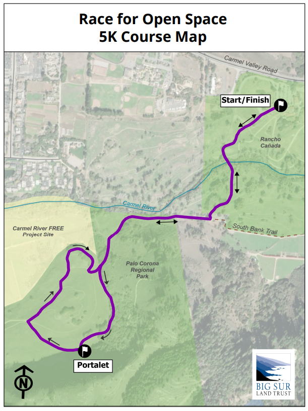 Our 5k course Start/Finish is at Palo Corona Regional Park Discovery Center, where restrooms and an aid station are available. Runners will follow well-tended trails through Palo Corona's Rancho Cañada, across the Carmel River, and along the much-loved Southbank Trail before entering the Palo Corona Regional Park front ranch (note that dogs are not permitted beyond the Southbank trail). From here, a gentle uphill takes runners to the foot of Inspiration Point (a portalet is available here), as they wrap through the front ranch on its wide and welcoming fire roads. Halfway through the course 'lollipop', runners/walkers are treated to a beautiful view of Big Sur Land Trust's Carmel River Floodplain Restoration and Environmental Enhancement (CR FREE) project site, and the ocean beyond, before completing the lollipop and continuing along familiar trail back to the Start/Finish.