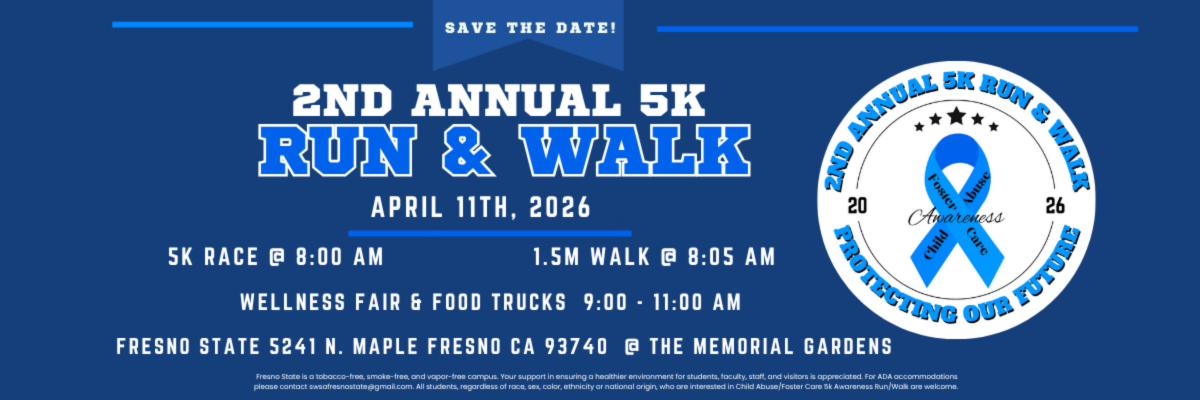 The Social Work Student organizations, Phi Alpha Honors Society, and Title IV-E program at California State University, Fresno are hosting a Child Abuse/Foster Care Awareness 5K Run/Walk, which will not only raise awareness about child abuse and Foster Care but also incorporate a wellness component for families. This dual-purpose event aims to both advocate for child safety and foster care, raising awareness of the need to support the well-being of families, caregivers, and foster youth. By promoting self-care and providing resources for mental and physical well-being, this event seeks to increase family and individual well-being. Proceeds will support next year's event to make this an annual event.