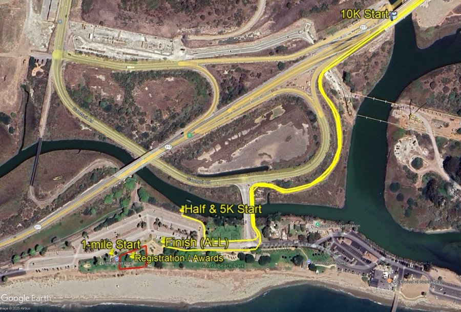Race venue is located at the beautiful Goleta Beach Park located in Santa Barbara County. Run course is on a dedicated asphalt course. Events include Half Marathon, 10K, 5K, and Kid's 1-Mile run.