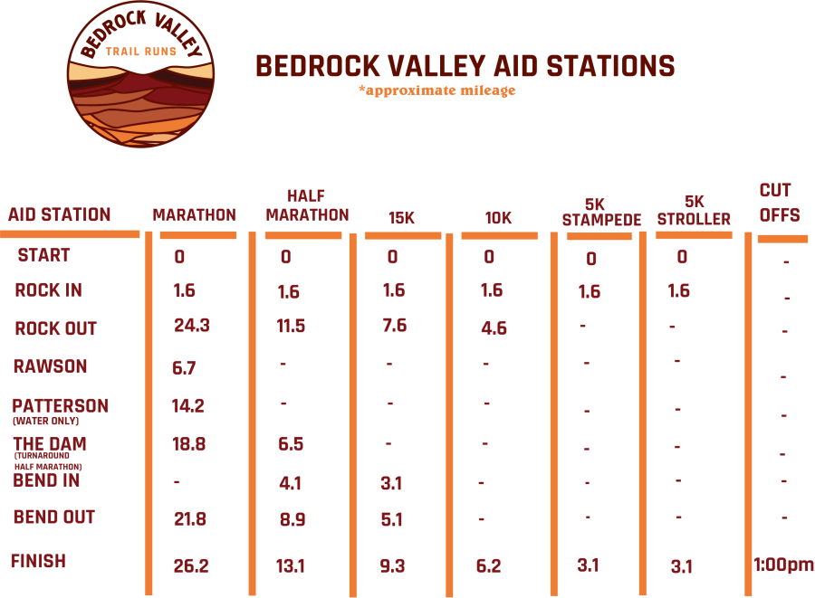 **Please note that each aid station has approximate mileage based on mapping programs, and may differ a bit from each person's watch, app, or other tracking devices.