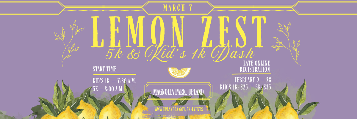 Come out and join the City of Upland for our 5th Annual Lemon Zest 5K & 1K Dash is the first of our 2026 Healthy Upland 5k Series This is the perfect family-friendly event to celebrate Upland's citrus industry. There's nothing sour about this 5K!