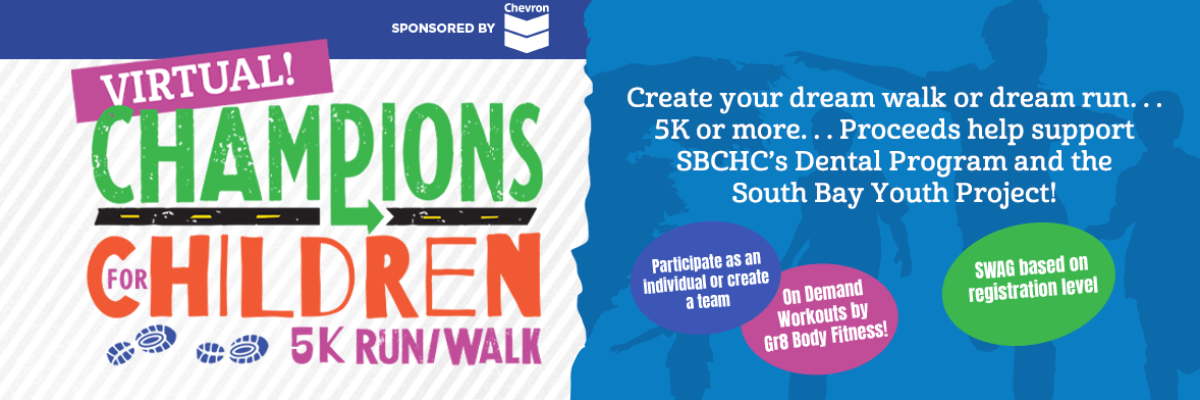 South Bay Children's Health Center is holding our annual Champions for Children Run/Walk virtually in 2020 out of an abundance of caution, with plans to be back on the trail in June of 2021. Our first-ever Virtual Run/Walk gives you a chance to create your own dream event at your favorite outdoor or indoor space as an individual or as part of a team. You can choose your registration level and even receive great SWAG. There is no age limit and everybody is welcome to participate in any physical activity of your choice regardless of experience. The goal is to create your personal dream event, have a great time, and help raise money for vital mental health and dental care at a time where low-income and at-risk families need our help more than ever!