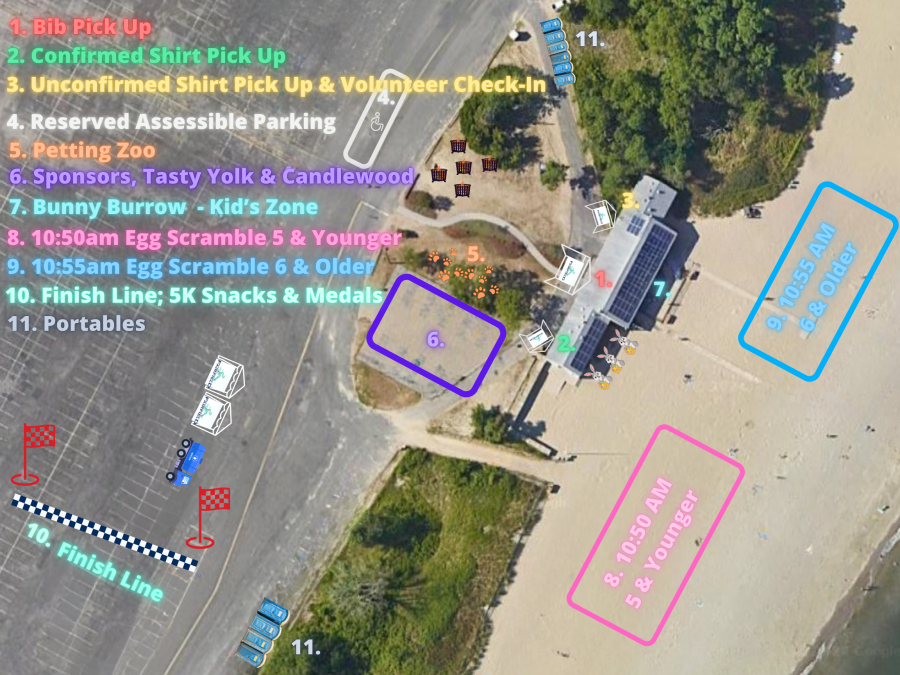 Our new start line location was very successful last year, and we’re excited to use it again for this event and in the future. The starting line for both the 5K Course and the Bunny Hop will be on Fairfield Beach Road, just past the entrance to the Fairfield Beach Club.