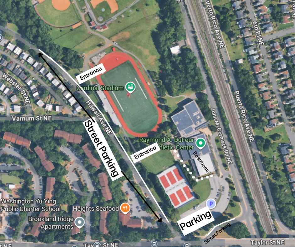 4400 John McCormack Rd NE, Washington, DC 20011 - the outdoor track and field complex is behind the DeFour Center. Enter “Catholic University DeFour Center” into your GPS