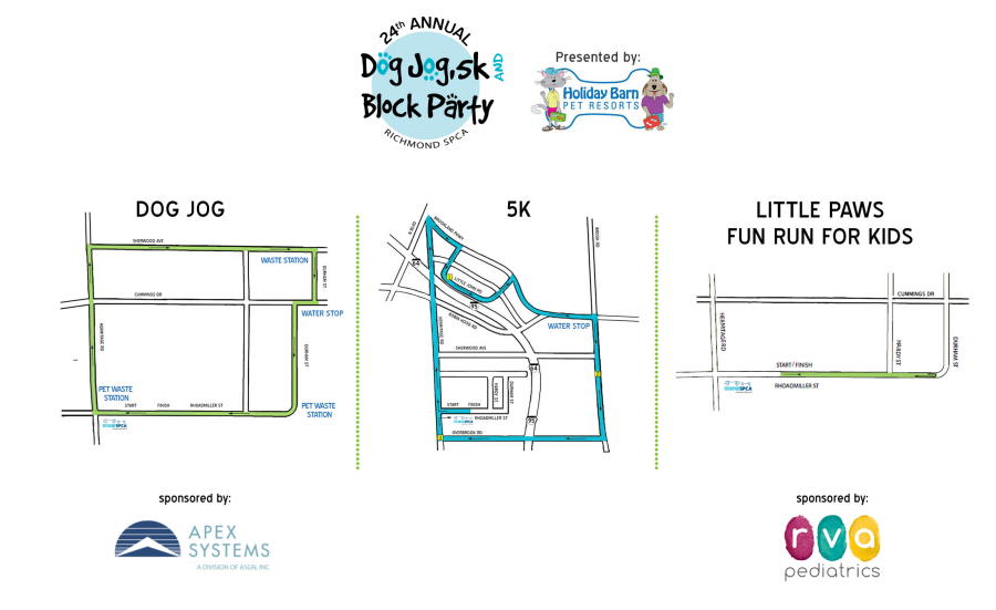 Our official 1-mile Dog Jog, 3.1-mile 5K and Kids' Fun Run courses will start and finish at the Richmond SPCA. Each race will begin outside the Richmond SPCA building. Richmond Road Runners Club will be conducting our on-site chip-timed 5K.