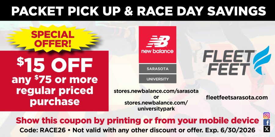 Packet Pickup @ Pine View School on Thursday, March 26, 2026 from 11am-1pm, and at New Balance Stickney Point from 4-7 on Friday, March 27, 2026.