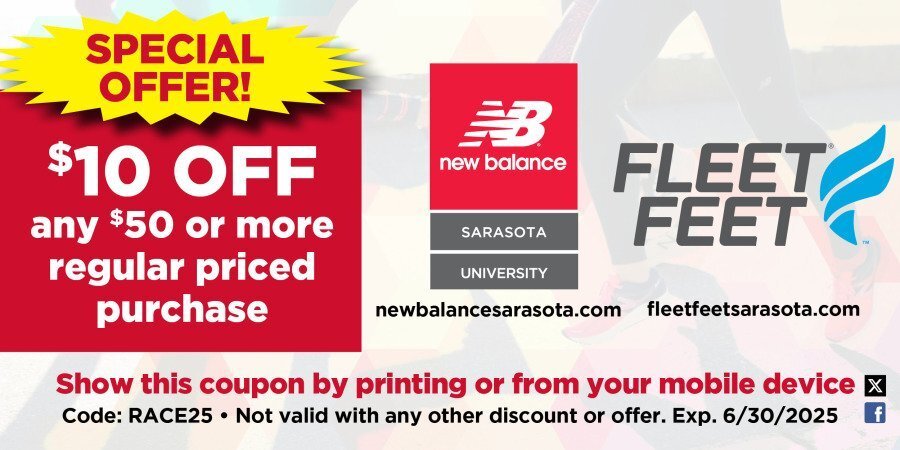 Packet Pickup @ Pine View School on Thursday, March 26, 2026 from 11am-1pm, and at New Balance Stickney Point from 4-7 on Friday, March 27, 2026.