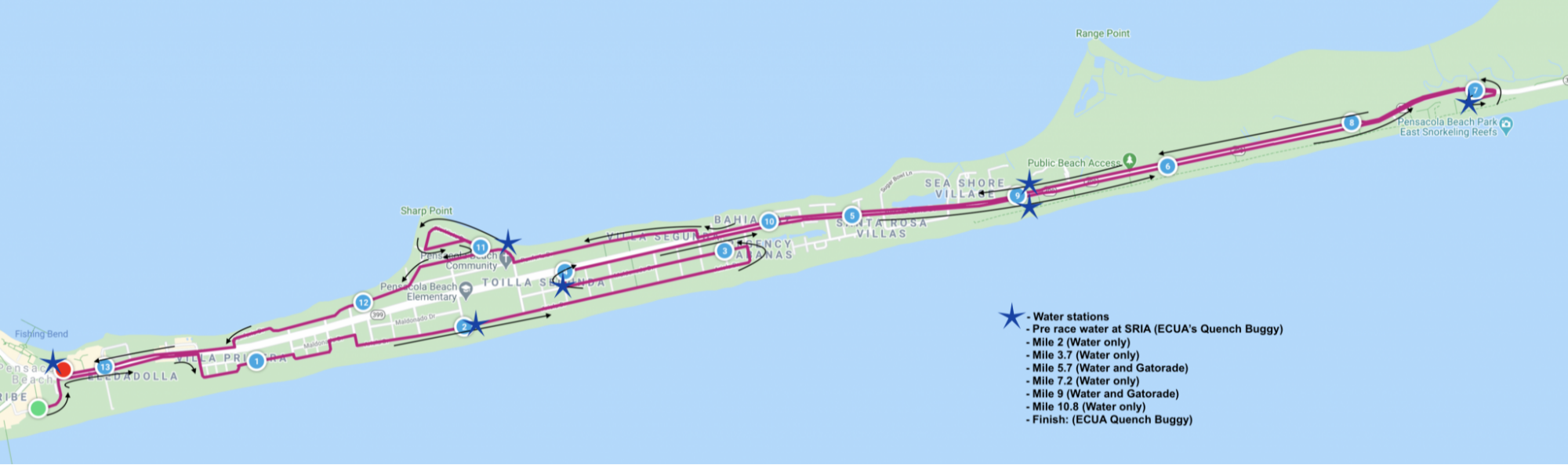 All races end in front of the Santa Rosa Island Authority (1 Via De Luna Dr, Pensacola Beach, FL 32561)