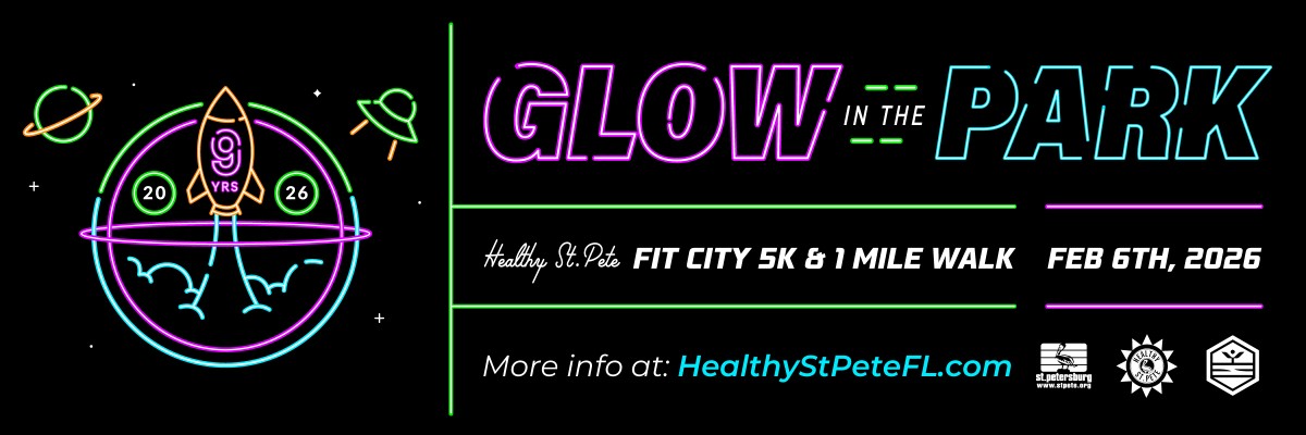 Healthy St. Pete is a division of the St. Petersburg Parks & Recreation Department. The mission of Healthy St. Pete is to build a culture of health in our city by making the healthy choice the easy choice through a collaborative community effort. Join us as we GLOW IN THE PARK with great music, fun glow games, a vendor village, and much more! Be sure to wear your favorite GLOW costumes to shine for health! Limited scholarships are available for race registration. Contact Rhenelle McSween-Navarro, Healthy St. Pete Supervisor, at rhenelle.mcsween-navarro@stpete.org for more information. To learn more about Fit City, contact Healthy St. Pete at 727-893-7494 or visit healthystpetefl.com.