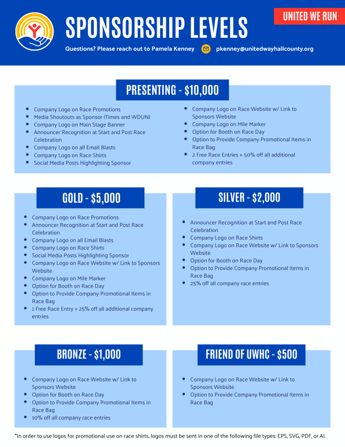 Events will be held rain or shine. In the event of dangerous weather, we will make every effort to reschedule. All entry fees are non-refundable and can be applied to the rescheduled event or donated to United Way of Hall County.
