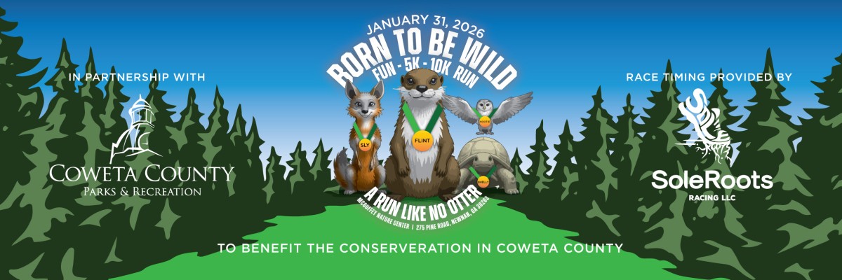 The Born to Be Wild 5K/10K/Fun Run is coming to McGuffey Nature Center at the Coweta County Fairgrounds on January 31, 2026. Lace up and join Sole Roots Racing, Coweta County, and the Southern Conservation Trust for a race that’s more than just miles—it’s making a difference. Every step you take helps us reach our fundraising goal to support conservation advocacy efforts, conserving land and protecting wildlife in our community. Join us for this family-friendly event! Dress up as your favorite SCT mascot, and each registered child can choose either a “Flint” the otter plushie or an event T-shirt.
