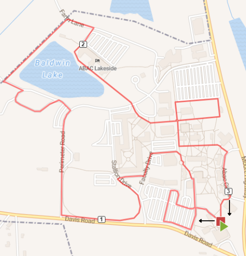 Welcome to ABAC! Starting and finishing right outside the gym, this course is entirely on campus and highlights major campus landmarks including the athletic fields, Rodeo Arena, Lake Baldwin, the cow pasture, ABAC Chapel, and the front circle where ABAC began in 1908.