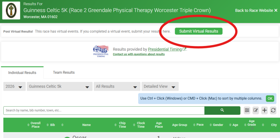 To submit your virtual results, you will head to RunRhody.com and select "Result" from the top navigation menu. From there, select 2026 and the race name, which will bring you to the results page. You will click a button on the top of the page that says "SUBMIT VIRTUAL RESULTS" to submit your time. See below for a visual of where this button is located.