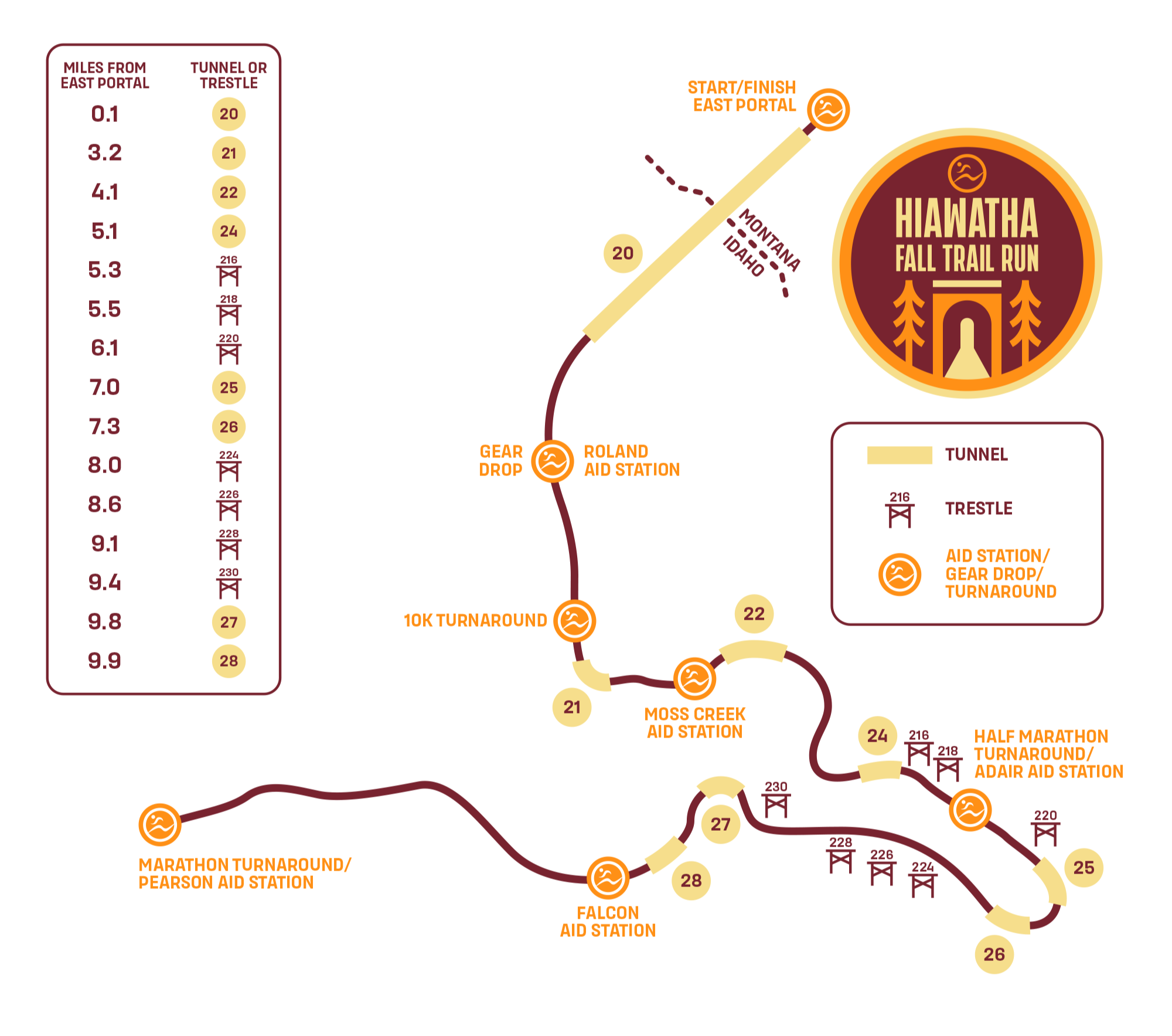 The Marathon course will start at East Portal and enter the famous 1.6 mile long Taft Tunnel. Runners will then exit the tunnel at Roland and hit their first aid station and a self service gear check near mile 2. They will continue past Tunnel 21 and will hit a second aid station near Moss Creek. After Tunnel 24, runners will start to cross a series of trestles. After Tunnel 24, runners will hit another aid station. Runners will continue on past another aid station at Falcon and then reach the turnaround aid station at Pearson. Runners will turn around at Pearson near mile 13.1. After turning around, runners pass 3 aid stations before passing the Roland aid station one more time, and will re-enter the 1.6 mile long Taft tunnel as they head back toward the finish.