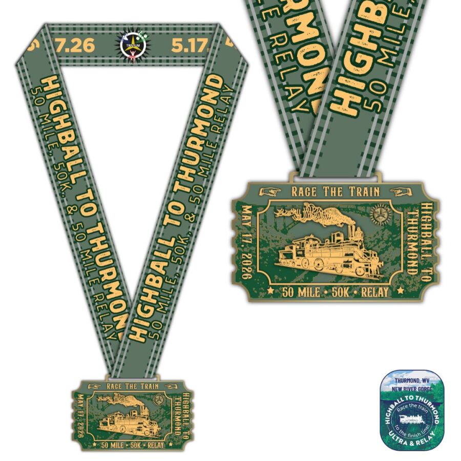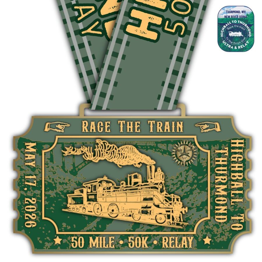 The 2026 Highball to Thurmond finisher medal is inspired by a vintage train ticket—an homage to the historic rails that trace the course through the New River Gorge and the journey runners take alongside them.