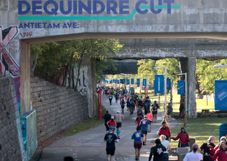 The course is a greenway 25 feet below street level that runs from Eastern Market to the Detroit Riverfront. It occupies a former Grand Trunk Western Railroad corridor that once served Detroit’s industrial riverfront and warehouses. It has been redeveloped into a paved, 20‑foot‑wide trail with separate lanes for pedestrians and bicycles. By rules of the Dequindre Cut, it will remain open to the public during the walk/run, however, course marshals will alert pedestrians and bicyclists of approaching runners.