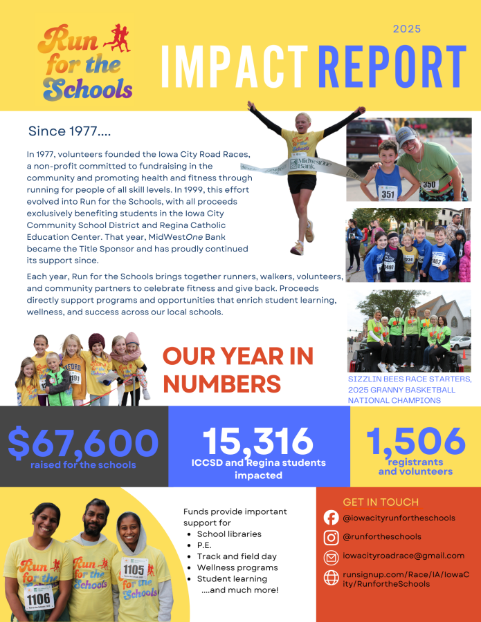 Run for the Schools directly benefits students from the Iowa City Community School District and Regina Catholic Education Center.