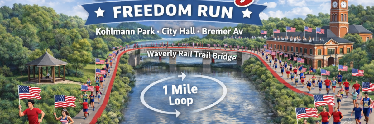 Kick off your Independence Day with a fun, family-friendly Freedom Run in Waverly! Starting at Kohlmann Park, participants will follow a scenic 1-mile loop across the wooden bridge, past City Hall, over the Bremer Avenue bridge, and back to the park. Choose to complete 1, 2, or 3 loops at your own pace—run or walk, all are welcome!