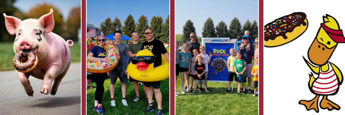 The Duck Donuthon is a fun run mixed with an eating competition designed for the whole family to enjoy! The course will be in McCowin Park, Ammon, Idaho, with some grass and a loop around the bike path. We'll have a nice big "pig pen" area with music and fun where you get locked up until you eat your donut. (You can check out the map on our website. This is a great activity for kids, runners, families, and die-hard crazies! Ollie, Duck Donuts mascot will be on hand to add entertainment and cheer you on.