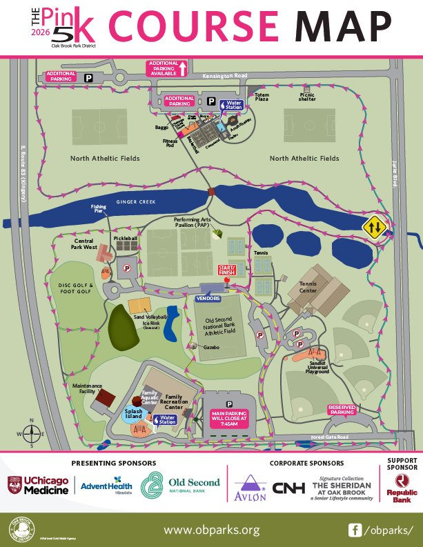 Get ready to lace up your sneakers and make a difference at the Oak Brook Park District Annual Pink 5K Run/Walk! It's not just a race—it's a chance to join the fight against breast cancer and show your support. Plus, 100% of the net profits from registration will go directly to the Hinsdale Hospital Foundation Open Arms Breast Cancer Outreach Fund, helping provide mammograms for women in need.