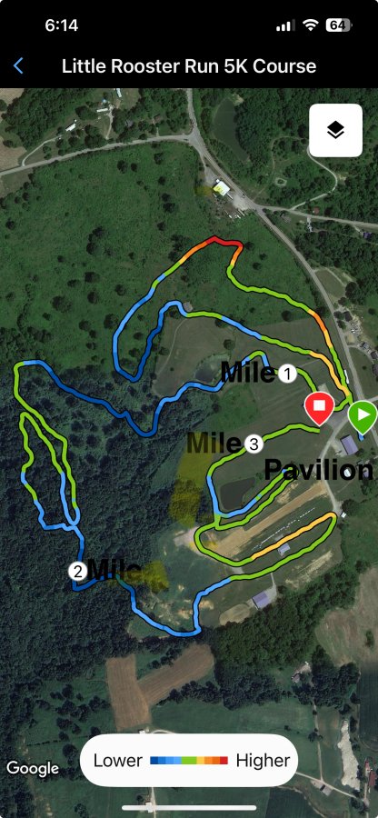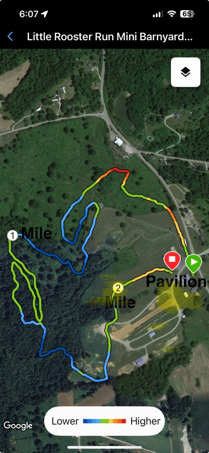 Runners in the 5K will need to be in the start corral next to the Pavilion (Large Shelter) near the facility entrance no later than 5 minutes prior to the start of their race. When the rooster crows runners in the 5K will head out through the barn on the challenging yet picturesque 3.187 mile loop course that winds through open park green-space and canopy covered trail that boasts nearly 400 feet of combined ascent and decent before meandering along and over the dam of the fishing pond on their way to the finish line.