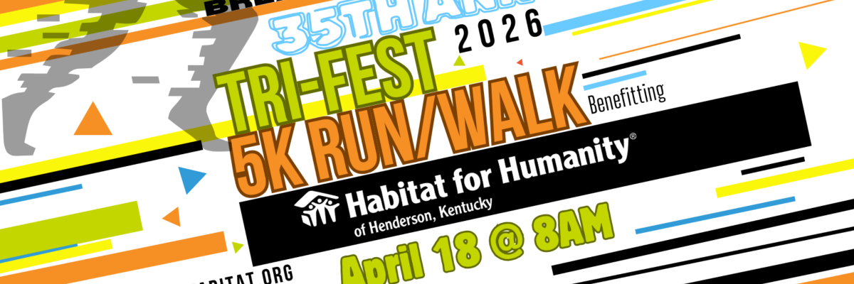The 35th Annual Breakfast Lions Club Tri-Fest 5K Run/Walk benefiting Habitat for Humanity of Henderson, KY will be on Saturday, April 18, 2026. This race will take place at Central Park downtown by the riverfront and start at 8am rain or shine! This is a certified 5K race route with medals and awards given out after the race. Pre-Registration bag includes a 35th Anniversary and 100th Home Limited Edition Tri-Fest 5K shirt, custom bib and swag bag full of additional goodies while supplies last. Habitat for Humanity will also be hosting the 9th Annual Habi-Tot Trot Kids Dash at 7:40 for kids ages 7 and under.