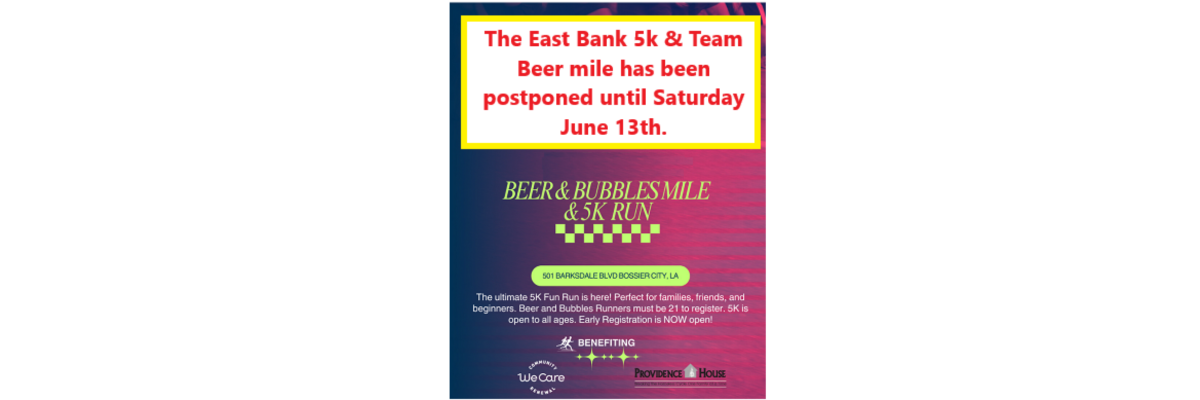 The East Bank 5k & Team Beer Mile has been postponed until Saturday, June 13th.