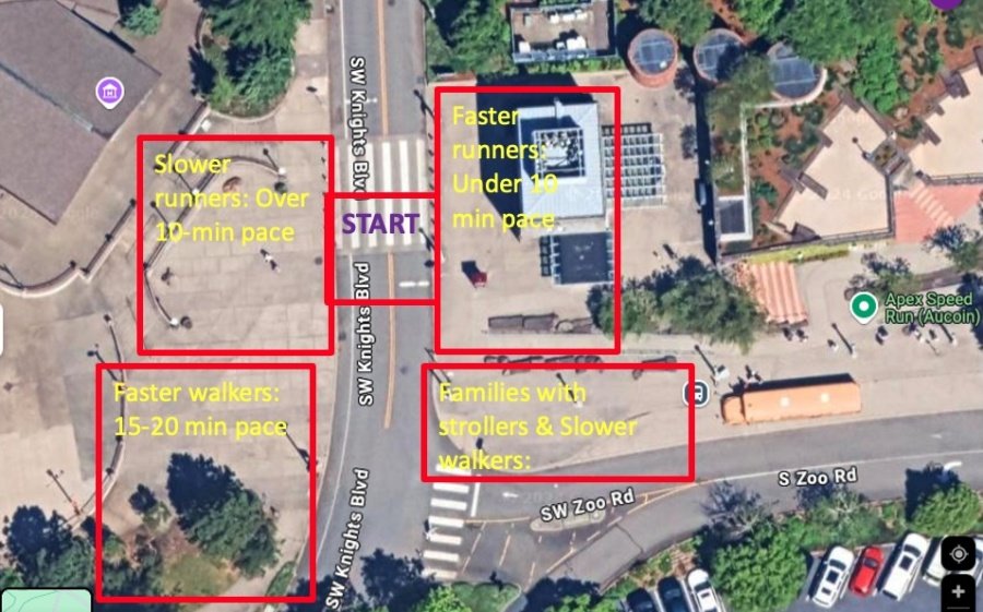 7:30am 5K Run start for faster runners (9 minute/mile pace or faster) at SW Knights Blvd start line between Oregon Zoo and Western Forestry Center.