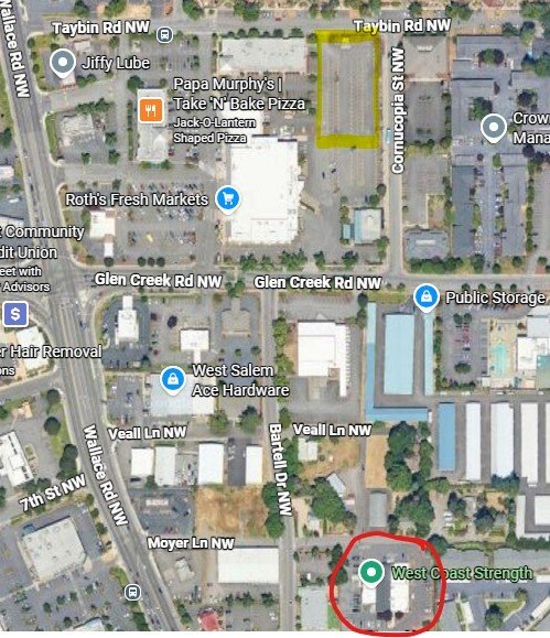 A: There is some parking at West Coast Strength and neighboring businesses and the North end of the Back lot at Roth's is available for overflow parking.