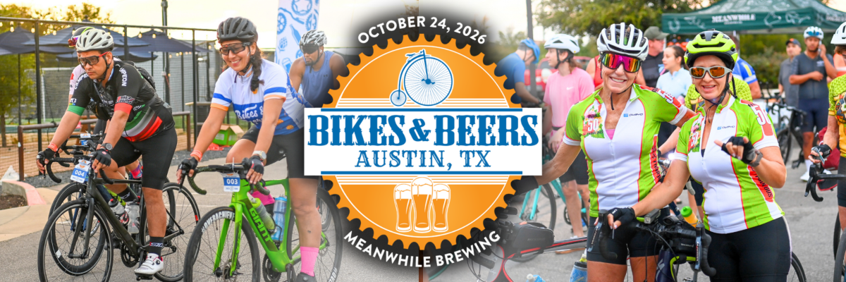 Register for Texas' 2nd Annual Bikes & Beers Austin - Bike Ride & Beer Festival 2026, the premier cycling event series departing from MEANWHILE BREWING in Austin, TX! Choose your challenge from a 15, 30, or 45-mile ride through the beautiful areas of trail and less-traveled roads of Austin. Complete with morning fuel stations, fully marked routes, rest stops, and SAG support for all riding levels. Finish back at MEANWHILE for an unforgettable post-ride beer festival atmosphere, where you'll enjoy two complimentary craft beers in an official B&B pint glass, live music, food trucks, games, sponsor giveaways, and a massive charity raffle with over $3,000 in prizes, all while benefiting local cycling charities. Have fun and give back!