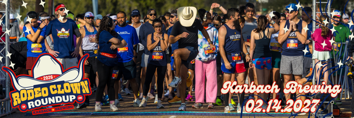 It’s rodeo season in Houston and the Rodeo Clown RoundUp is BACK! Join us on Sunday, February 14, 2027, at Karbach Brewing Company for a chip timed 5K and 10K and kick off rodeo season the best way possible.