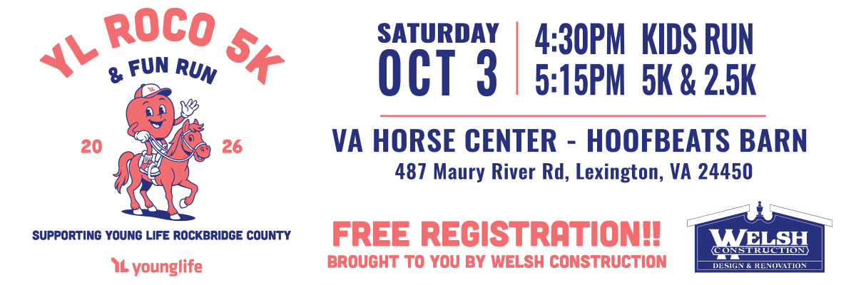 Come on out and join us for the Third Annual YL RoCo 5k & Fun Run in support of Young Life in Rockbridge County! REGISTRATION IS FREE FOR ALL RACES! We are planning to have a beautiful twilight race at the VA Horse Center Hoofbeats Barn. Whether you're an olympic hopeful, a jogger, or walk the whole time we would love to have you out with us. The route will go from the Hoofbeats Barn through the beautiful VA Horse Center woods and property. We will have food trucks on site for you to purchase food after the race.