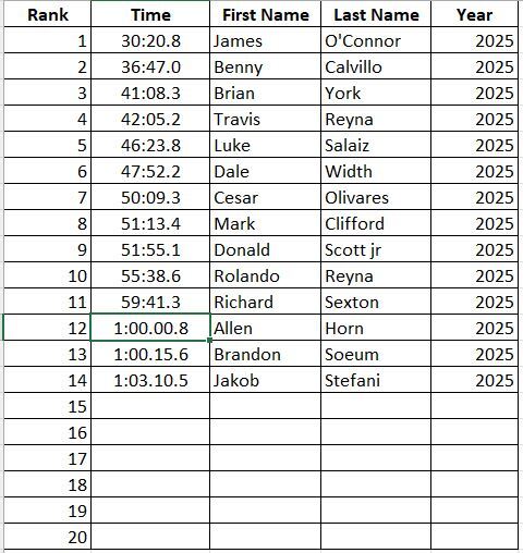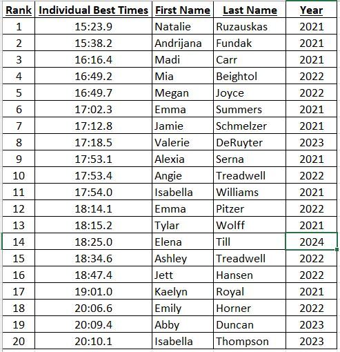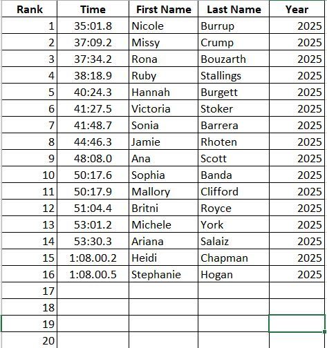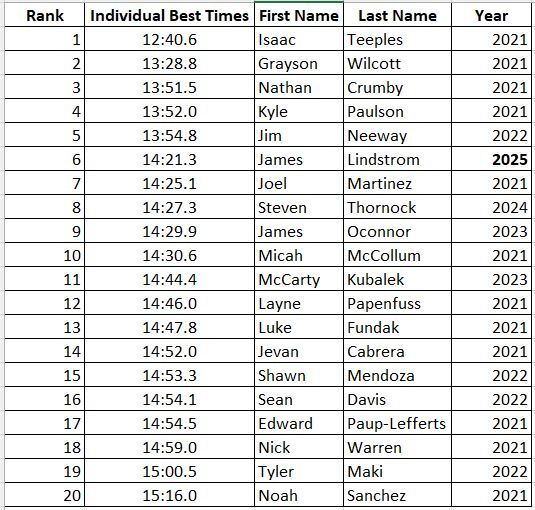 HISTORY OF 20 PERSONAL BEST TIMES (2.5-Mile Race Began in 2021; 5-Mile Began 2025)