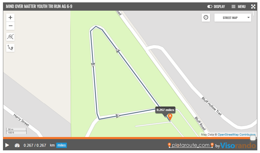 Ages 13-15: ~150 yd pool swim (9 pool lengths), ~2.4 miles bike (9 loops), ~0.9 mile run (3 loops)