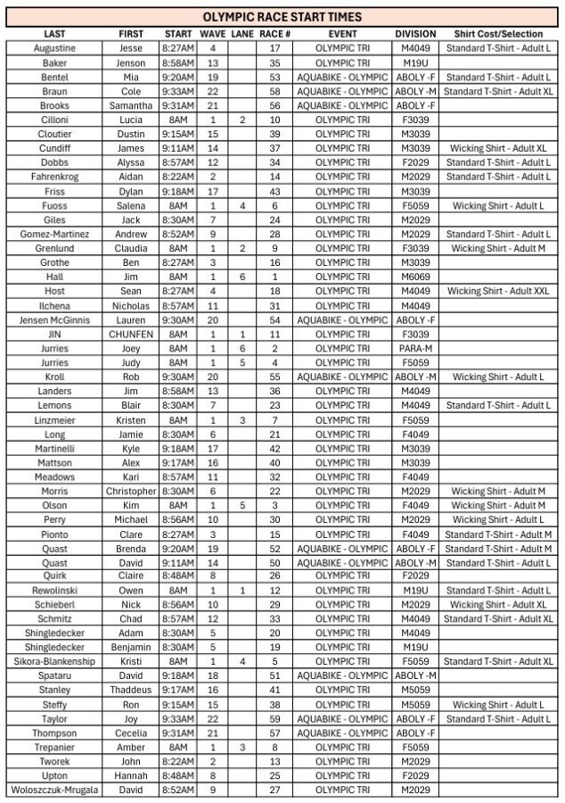 1. OLYMPIC Tri: 1000 yd swim, 26.5 mile bike, and 6 mile run (wave start range is 8am-10am)