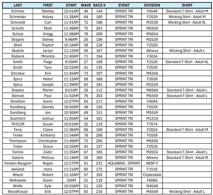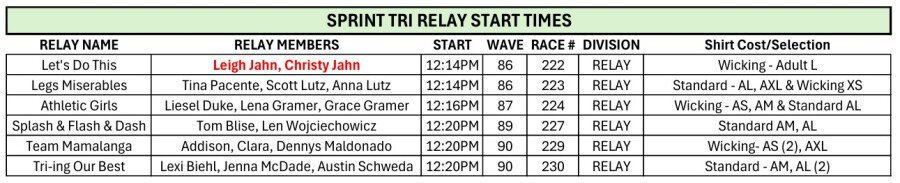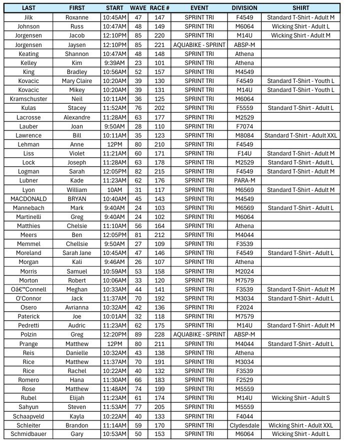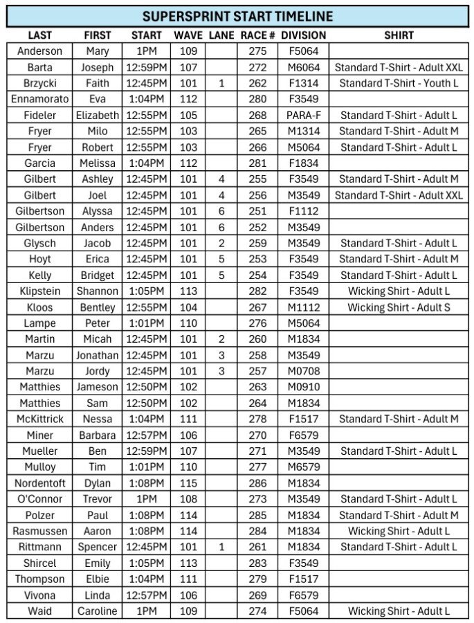 1. SUPER SPRINT Tri: 250 yard swim, 6.5 mile bike, 2 mile run (waves start range is typically 11am-12:30pm)
