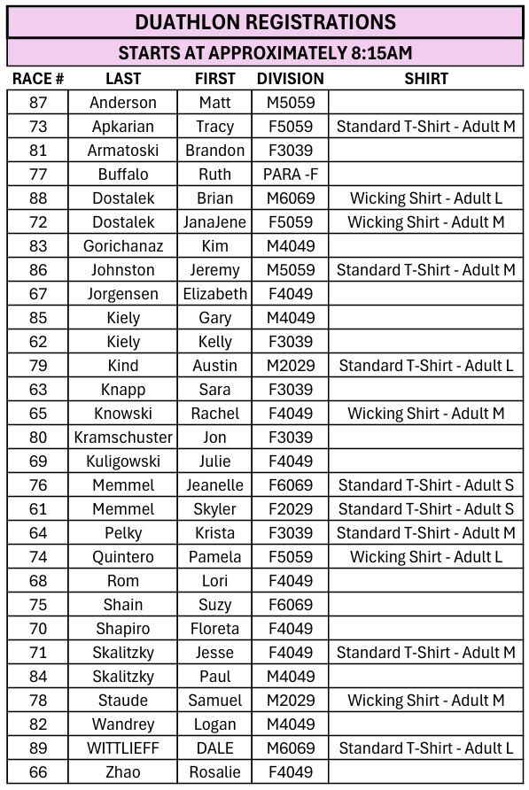 4. DUATHLON: 2 mile run, 13 mile bike, 2 mile run Starts at approx 8:15am