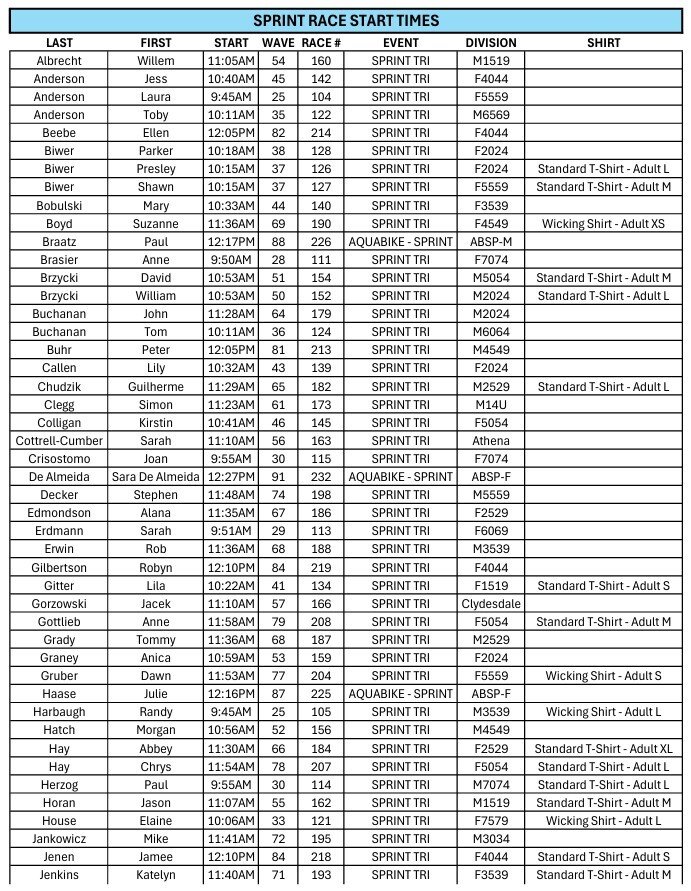 3. AQUABIKE SPRINT: 500 yd swim, 13 mile bike (wave start range is typically 10am-12pm)