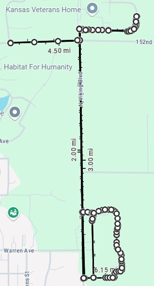 LOOP 2: After the second Veterans Home leg, turn right onto Banner Rd. Turn around at WWII Memorial Drive and then head back south on Viking Blvd. Re-enter again at the high school (where you first exited). Turn left and then go all the way around the school to finish. Access a water station on each loop at the Kansas Veterans Home.