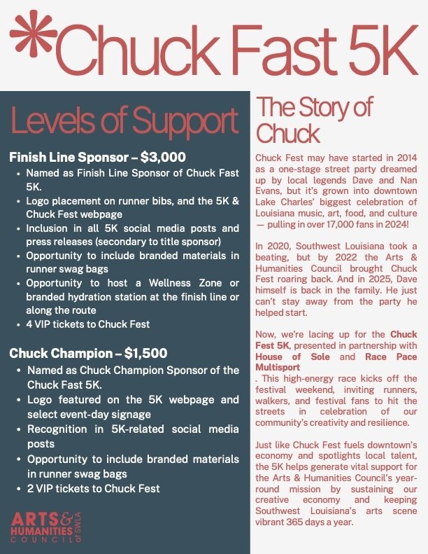 This exciting event is more than just a fun run — it’s a fundraiser supporting the Arts & Humanities Council of Southwest Louisiana. By registering for the ChuckFest GleauxRun, you’re helping fuel the arts, culture, and creative spirit that make Southwest Louisiana so unique.