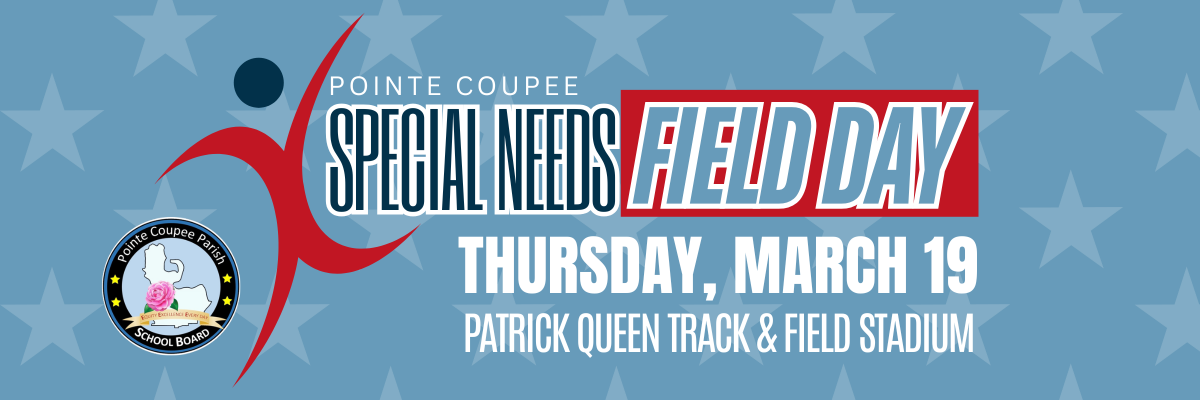 The Pointe Coupee Parish School Athletic Department is excited to announce that the inaugural Pointe Coupee Special Needs Field Day will be held on Thursday, March 19 at the Patrick Green Track & Field Stadium. Events are scheduled by grade group: Head Start through 6th grade will participate from 9:00 AM to 11:00 AM, and 7th through 12th grade will participate from 11:30 AM to 1:30 PM.