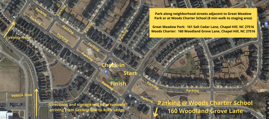 Sprawling over 900 acres on the south side of Chapel Hill, NC, Briar Chapel is a green community that boasts a vast network of forested hiking and mountain biking trails. In addition to fantastic trails, centrally located Great Meadow Park, with its beautiful lawn, stage, and pavilion, offers the perfect location to stage this event. Park on the neighborhood streets adjacent to Great Meadow Park (161 Salt Cedar Lane, Chapel Hill, NC 27516). Overflow parking will be available at Woods Charter school about .3 miles from the staging area (160 Woodland Grove Lane, Chapel Hill, NC 27516)
