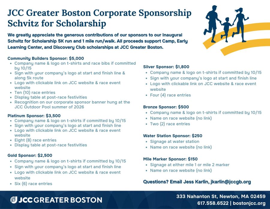 Join us on Sunday, November 2, 2025, for JCC Greater Boston's first annual Schvitz for Scholarship 5K/1 Mile Walk and Family Fun Run Fundraiser! Lace up your sneakers and hit the flat and fast, tree lined course on Wells Ave loop in Newton. You’ll enjoy fresh fall air and a lively community atmosphere. All ages and abilities are welcome. Bring your family and friends to help support camp, early learning center, and Discovery Club scholarships at JCC Greater Boston. Strollers and leashed dogs are welcome! Whether you're running, walking, or cheering, it’s a chance to move with purpose, give back, and Find Your Impact!
