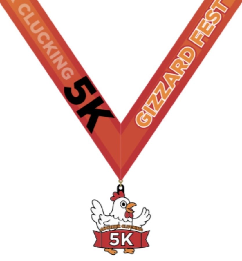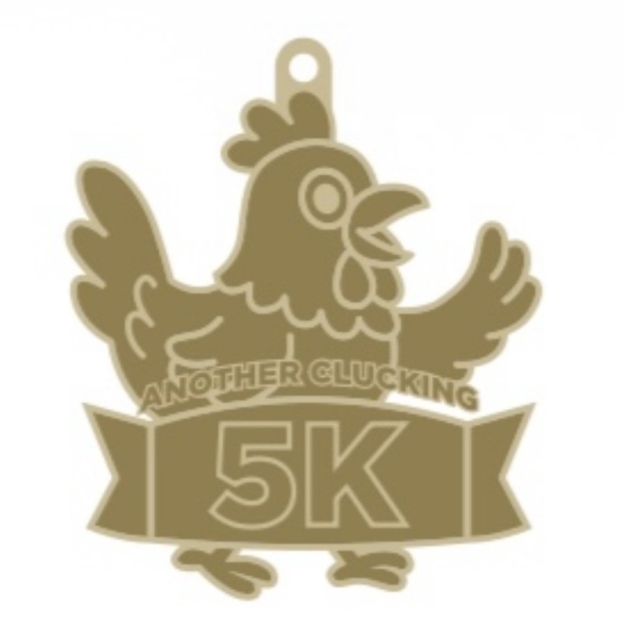 These finisher medals will be provided for each race finisher: exhibiting your dedication, hard work, and ability to finish Another Clucking 5K. Show these off; your family and friends will be jealous...maybe they should have signed up.