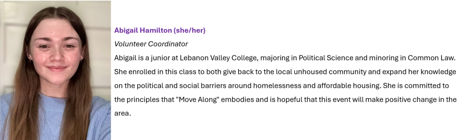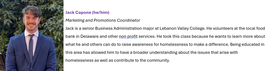 This event is being organized as part of a college course. The course aims to provide an immersive experience in which students will evaluate the conditions contributing to and maintaining the homelessness crisis and will 1) advocate for fair and affordable housing policies at the local and state government levels, 2) volunteer at local organizations supporting individuals experiencing homelessness or housing insecurity, and 3) develop and implement a consciousness-raising project for the campus community. This is our consciousness-raising project, and we appreciate your support!